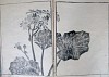 Three Volumes. Yamaguchi Soken lived from 1759 to 1818 in Kyoto, a distinguished pupil of Okyo. He was skilled at figures, landscapes, flowers and genre subjects. The link with Okyo, his dwelling in Kyoto and the period of his life make him very central in the Shijo subject. These three volumes described by Mitchell, pages 498-9, show great skill and sensitivity in every use of black and shades of grey, to illustrate plant forms. The compositions across two pages are fine instances of early sensitivity in these books, both bold and in each instance characteristic of the habits of the plants or grasses. Nothing is too simple for illustration and each receives treatment as from the inside of the plant's growth. We again see in Soken's work, or in his engraver's treatment of it, the granulated effect which fascinates Hillier. Many instances of double-page illustrations in this book are extraordinary displays of printing and of design and flower art. These three volumes are in their original embossed grey covers and title labels, though the first volume has probably been united with the other two at some stage for its covers are worn and frayed, whereas the other two are fresh. It could even be an earlier issue, the paper specially soft and delicate, but that is not more than a guess. The Mitchell copy was bound together as one volume. Hillier has a great deal to say about Soken. Of this particular book Hillier writes ' This is a masterpiece and it is as much as triumph of the woodblock makers as it is of Soken'. He becomes quite lyrical about it: 'Soken was not an explicit mystic: he drew his leaves and flowers with firm lines and unerring decorativeness, but occasionally, aided by block cutters who acted like an intensifying prism, his prints reached down to depths of our being with reactions on our part that cannot be rationalised'. This is the book Hillier takes as a particular instance of the effects which fascinated him, achieved by lowering parts of the block and by the granulation of ink tone. Several are reproduced. HIllier 536-7